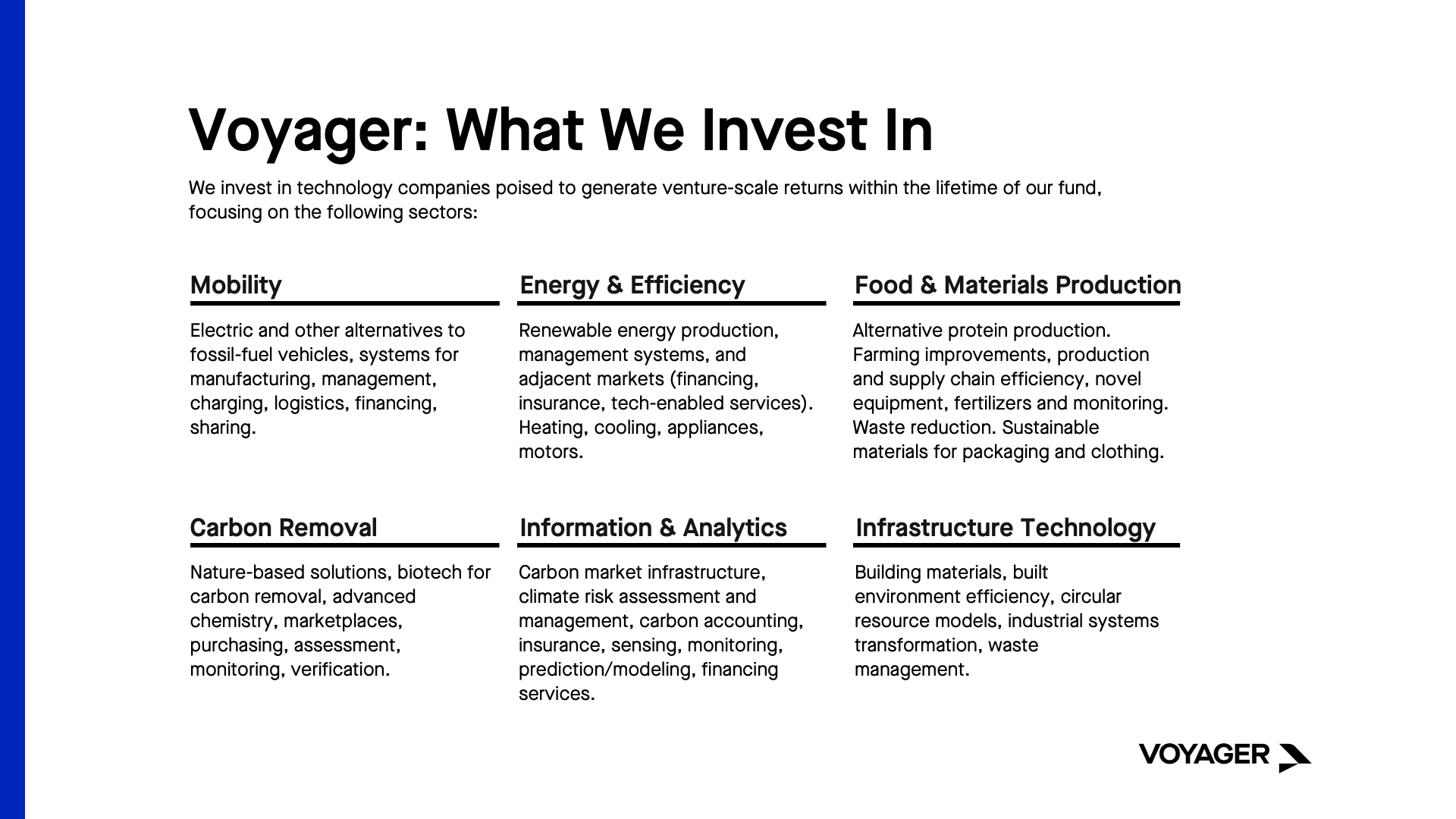 - Third, we must also invent. That means inventing wholly new processes and business models for infrastructure, food and materials, and carbon removal. This is a point of particular optimism for us. Voyager, as an early-stage investor, can see the very frontiers of what is possible from conversations with visionary founders, and can accelerate their commercial scale.